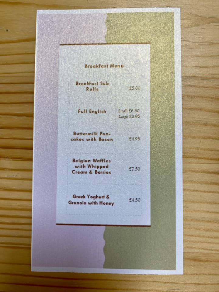 Breakfasts range from traditional plates to unique options such as pizza box fry-ups, available for eat-in or takeaway. Prices start from £7.00.